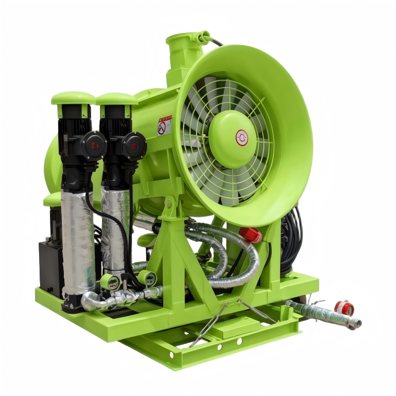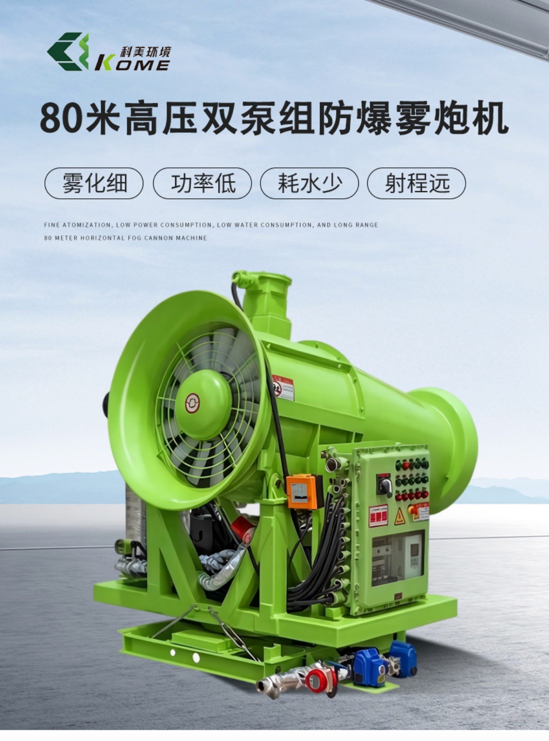 本款80米高压双泵组防爆雾炮机,专为存在易燃易爆气体或粉尘的危险作业环境而设计。设备采用双泵组增压系统与防爆电气设计,在实现远距离、大面积抑尘降尘的同时,确保在煤矿、化工厂、电厂等高风险场所的安全可靠运行。 设备射程可达80米以上,单台覆盖面积超过20000平方米,是大型工业场所粉尘治理的理想选择